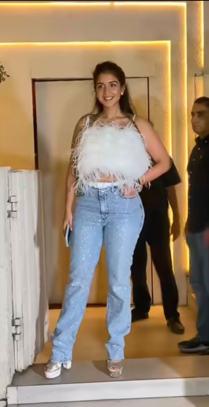 On December 16, 2022, Radhika Merchant was spotted arriving at a friend's birthday party in Bandra. For the outing, the gorgeousness donned a white-hued faux fur tube top and looked like a vision in white. She paired her feathery top with blue-hued blingy denim pants and completed her look with a pair of high heels. Ditching heavy makeup, Radhika flaunted her beautiful smile and accentuated her look with a pair of diamond studs. Moreover, she opted for a half-tied hairdo and made heads turn as she arrived at the venue.