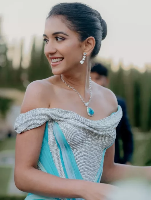 Recently, Vogue unveiled a series of photos from the second pre-wedding event of Anant and Radhika. The Ambanis’ cruise ship banked at the shores of Cannes, where the guests disembarked for a glamorous masquerade ball. The event was held at the prestigious Chateau de la Croix des Gardes on May 31, 2024. On the third day of the cruise bash, the bride-to-be made a fashion statement with a custom-made Versace dress in shades of blue and silver, perfectly mirroring the hues of the Cote d’Azur. However, it was her exquisite jewel that truly caught our attention.