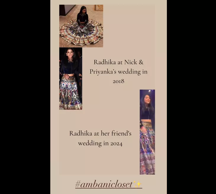 Earlier, Radhika was spotted dancing her heart out at her friend's sangeet ceremony. However, her look for the same occasion was also drool-worthy. To attend the program, she opted for a stunning lehenga from the shelves of ace designer, Abu Jani Sandeep Khosla. She teamed it with a black-hued velvet blouse, featuring golden gota works on the sleeves and neckline. However, as per an Ambani fan page, Radhika wore this lehenga choli at Priyanka Chopra and Nick Jonas' wedding in 2018. Undoubtedly, she gave pure sustainable goals by repeating her outfit. She completed her look with minimal accessories, subtle makeup, and an open hairstyle.