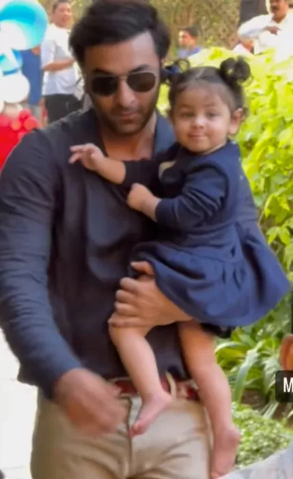 It seems like Ranbir Kapoor is clear that he doesn't want his daughter, Raha Kapoor to pose for the paps, but he will not even stop them from clicking her pictures. Ranbir didn't especially pose with his daughter, Raha, as he made his way to Kareena's son Jeh's birthday bash, but he was clicked while coming out of the party. Raha looked super happy donning a black-hued dress. We loved her tiny diamond earrings that made her sparkle. On the other hand, Ranbir looked handsome in a crisp black-hued shirt. He adorably held his baby girl in his arms.