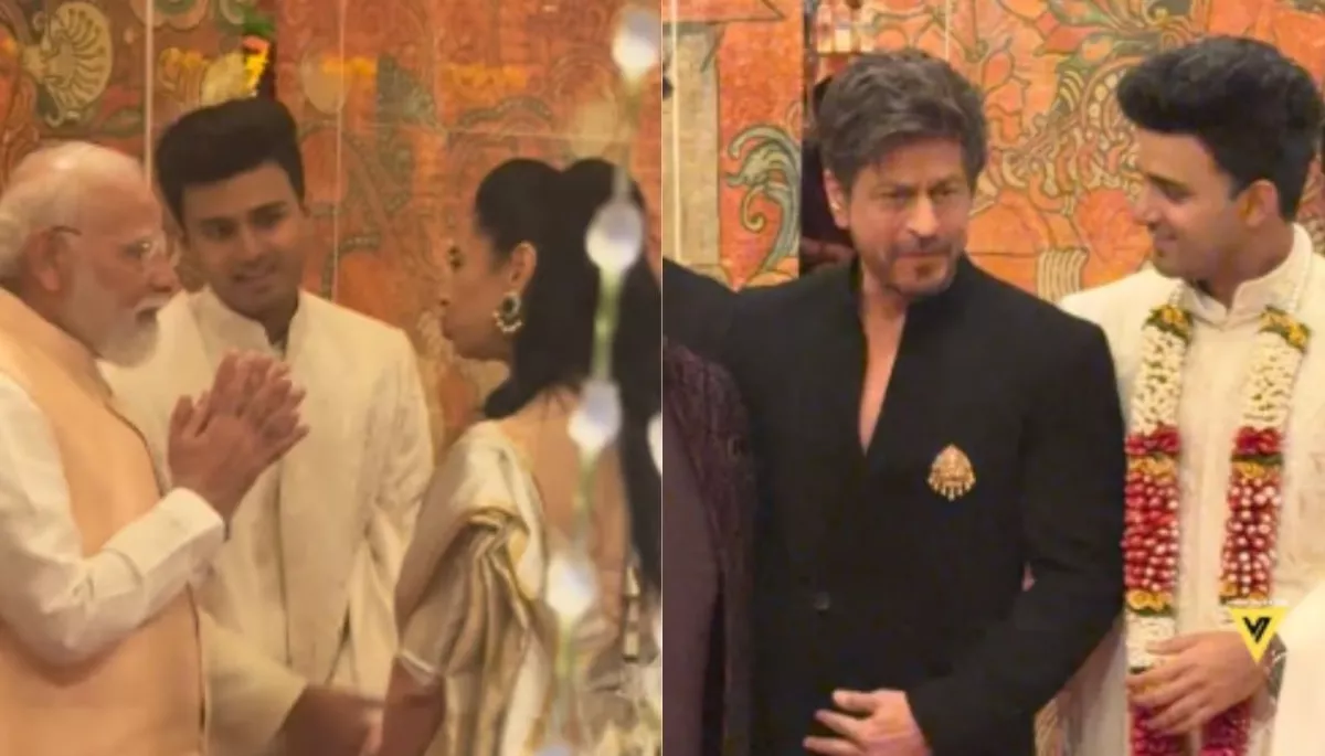 Shah Rukh Khan also attended the bash with his manager, Pooja Dadlani. The actor showed off his salt and pepper look while posing with the newlywed couple. He was dressed up in a black bandhgala ensemble. The bash was also attended by Home Minister Amit Shah and the director Bhushan Kumar.