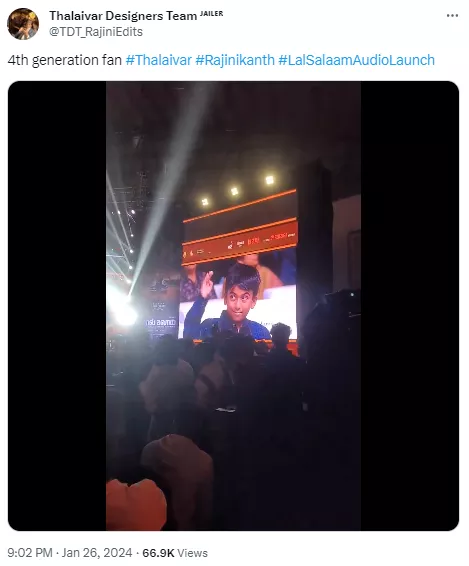 Rajinikanth's entire family was present including his wife, Latha, their daughters, Aishwarya and Soundarya, and grandchildren, at the audio launch event of his upcoming film, Lal Salaam's audio launch in Chennai. The film is directed by his daughter, Aishwaryaa Rajinikanth and is set to release on February 9, 2024. Now, in a video shared by an X user from the same event, we can spot one of his grandkids seated beside his mommy, Aishwaryaa. Initially, the little kid was seen giggling, whereas later, he cutely did his grandfather's trademark 'Salaam' gesture and repeated that three times. The video went viral on social media and is simply serving family goals.