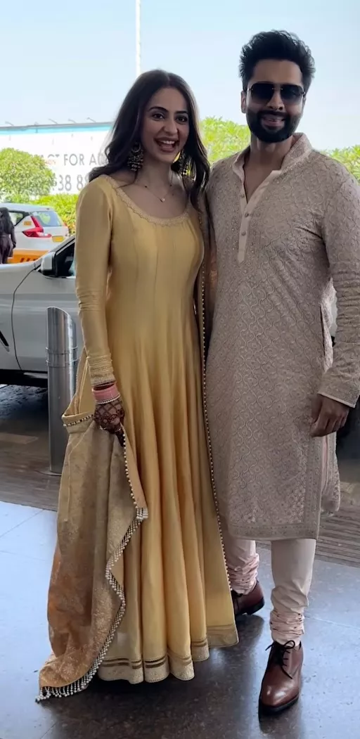 On February 23, 2024, Rakul Preet Singh and Jackky Bhagnani returned to Mumbai post their wedding soiree. However, it was the new bride, Rakul's look for the day that won our hearts. For the day, the diva stunned in a yellow-hued anarkali, which she teamed with a matching dupatta featuring tassel detailing. Rakul could also be seen flaunting her sindoor-clad maang, mangalsutra, and pink chooda at her first public appearance with Jackky as husband and wife. Jackky, on the other hand, looked handsome in a chikankari kurta. However, the duo looked like a match made in heaven.