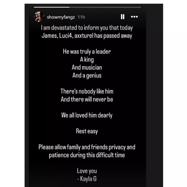 "I am devastated to inform you that today, James, Luci4, Axxturel have passed away. He was truly a leader, a king, musician and a genius. There is nobody like him and there will never be. We all loved him dearly. Rest easy. Please allow family and friends privacy and patience during this difficult time. Love you. Kayla G."