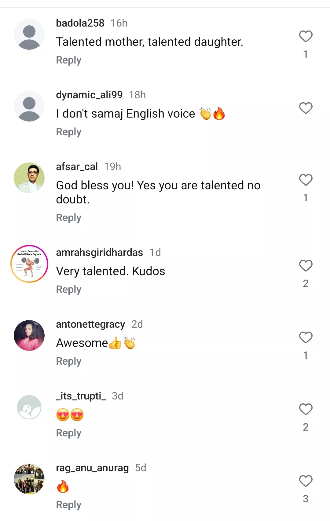 Although the video was shared more than a year ago, several fans revisited the old video and expressed their appreciation in the comments section. One user compared her with her mother and wrote, "Talented mother, talented daughter' and another wrote, "God bless you! Yes, you are talented, no doubt." A user suggested, "You should release songs," while a fan mentioned, "You resemble young Demi Lovato."