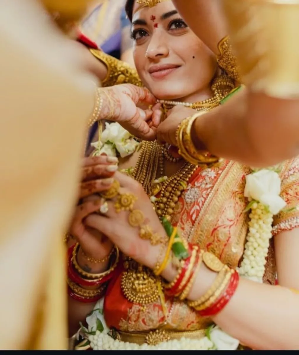 Rashmika Mandanna looked like a vision at her wedding with Vijay Deverakonda. For the Telugu wedding, she donned a traditional saree and accessorised it with matching gold jewellery. While Rashmika made her gold jewellery do all the talking, we got a glimpse of her diamond wedding ring, which had a square setting. It accentuated her overall royal bridal look.