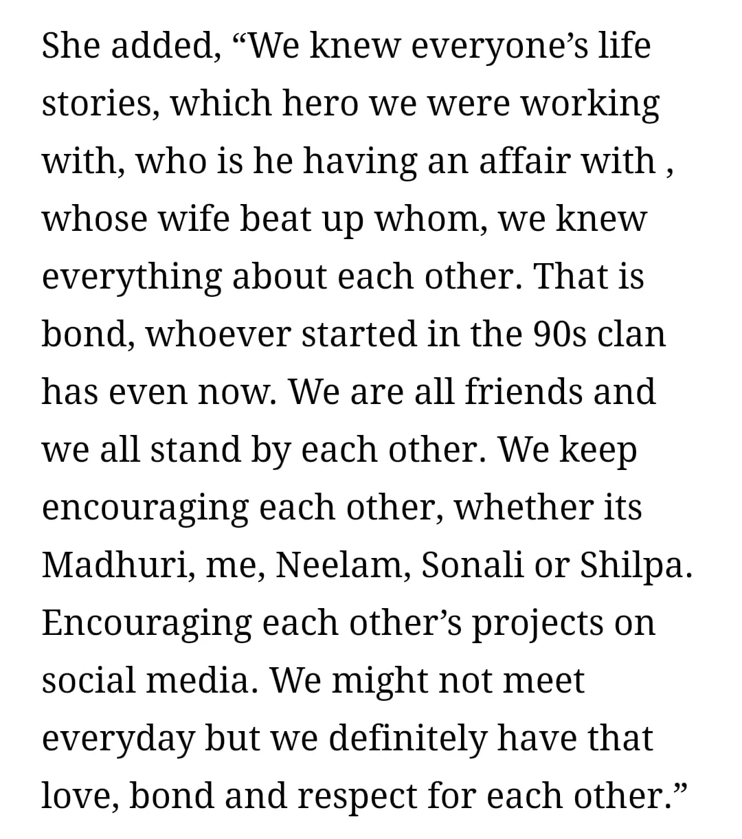 “We knew everyone’s life stories, which hero we were working with, who is he having an affair with , whose wife beat up whom, we knew everything about each other. That is bond, whoever started in the 90s clan has even now. We are all friends and we all stand by each other. We keep encouraging each other, whether its Madhuri, me, Neelam, Sonali or Shilpa. Encouraging each other’s projects on social media. We might not meet everyday but we definitely have that love, bond and respect for each other.”