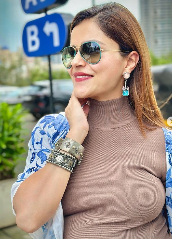 Taking to her IG handle, Rubina Dilaik posted an array of pictures, wherein she can be seen flaunting her cutesy baby bump in a beige-hued ribbed bodycon dress, which she teamed with a white and blue-hued shrug. To complete her uber-cool look of the day, Rubina chose a pair of cool sunnies, dangling earrings, and silver bracelets. Light touch-ups and open tresses added stars to her look. With a pair of classy slippers and a tote bag, the mommy-to-be finalised her look, and her pregnancy glow in these photos were simply unmissable. Sharing the photos, Rubina wrote:
