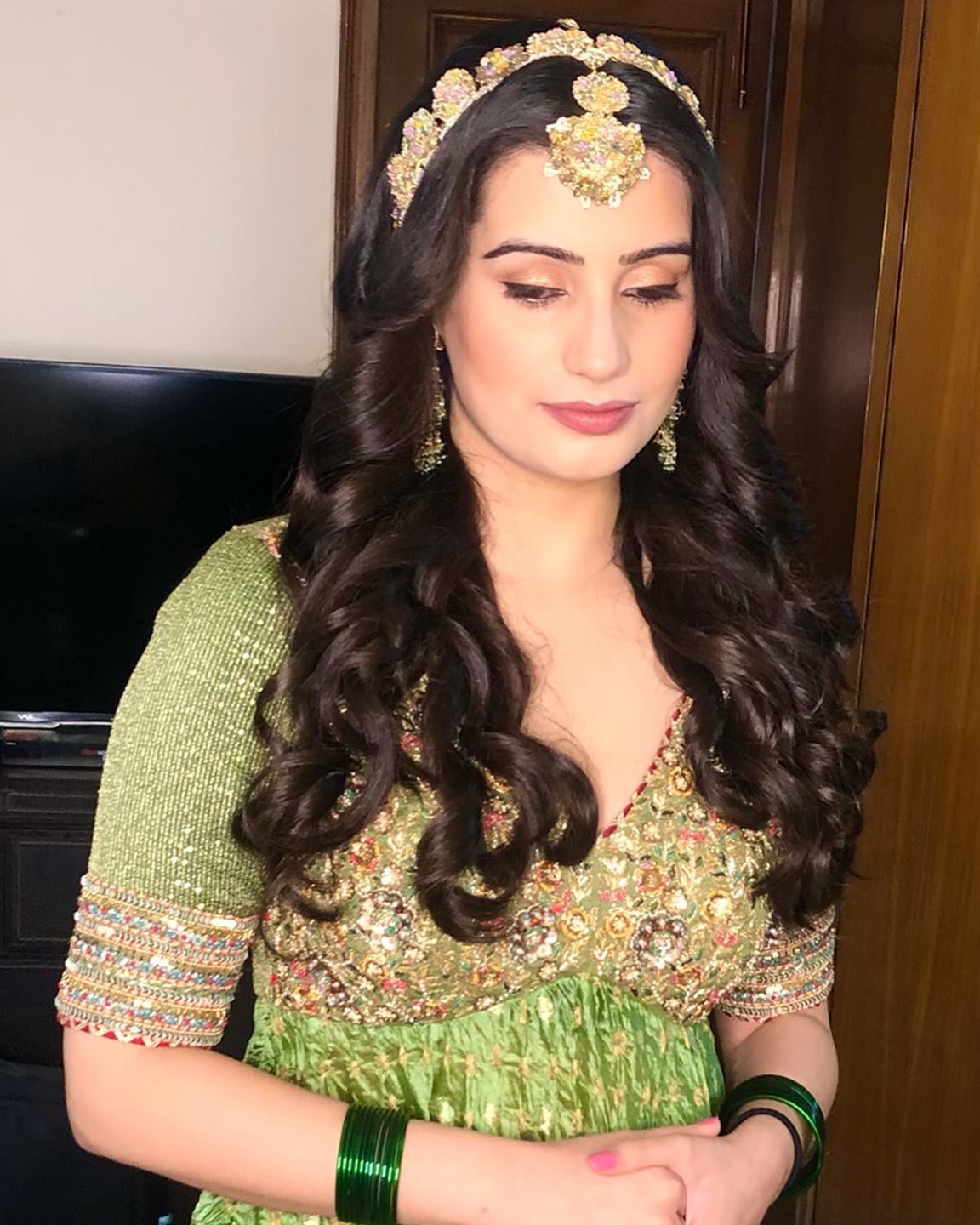 For the mehendi ceremony, the bride had worn a beautiful green-hued sharara set. Her outfit had featured a green-hued kurta with yellow-coloured sharara. She had ditched the heavy jewellery and had opted for a statement sheesh patti and a pair of earrings.