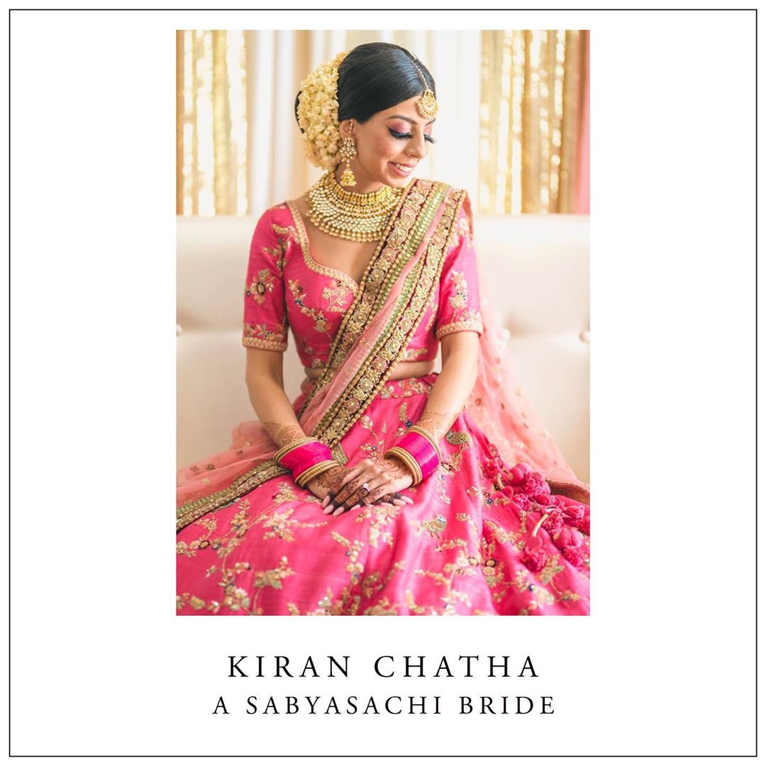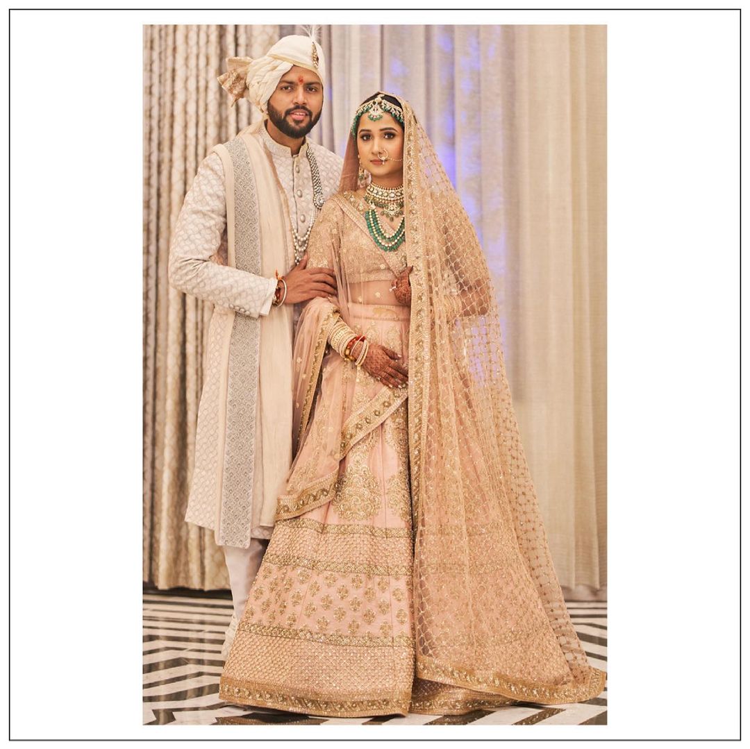 For the wedding day, Kiran had picked Sabyasachi Mukherjee's rani pink lehenga with his signature floral embroidery all over it. Along with it, she had donned an exactly matching chooda and minimalistic kaleeras. She had adorned a choker neckpiece with matching earrings and a maang teeka. On the other hand, her groom had opted for a beige sherwani with a pink stole and a pink turban.