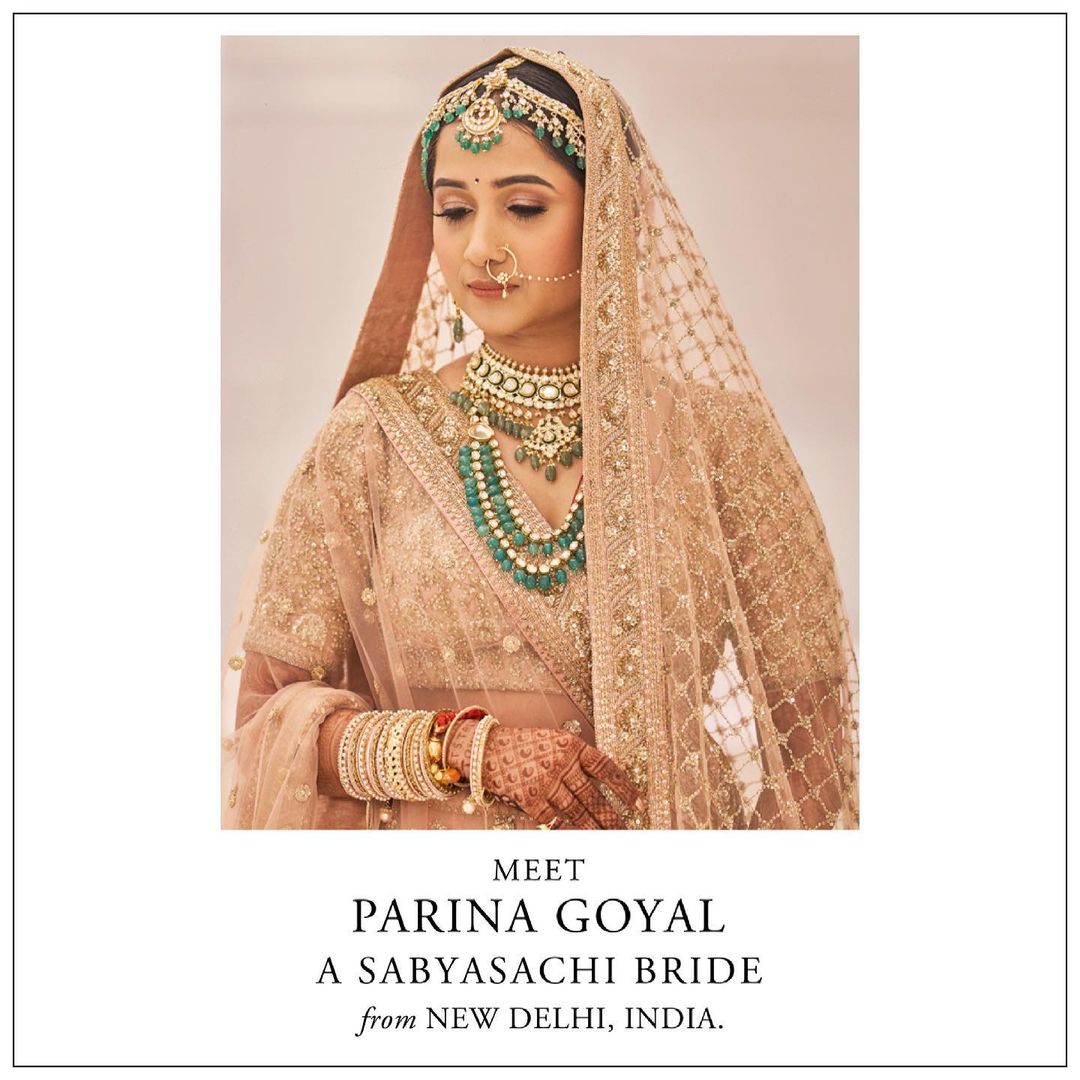 Meet Sabyasachi Mukherjee's bride, Parnia Goyal, who had tied the knot with her dream man, Kushank at the Leela Palace, Jaipur, Rajasthan. Her ensemble comprised of a lehenga with a matching blouse and a double dupatta.