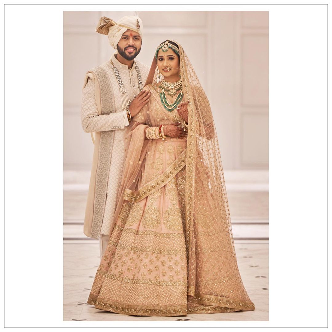 The bride had accentuated her outfit with a pop of emerald green jewellery. She had accessorised her look with a matha patti, two neckpieces and a nath. Her look was finished off with dewy sheen makeup and pink-toned blush. On the other hand, her groom looked dapper in an ivory-coloured sherwani with a matching doshala and a turban. His look was complemented with a statement neckpiece.