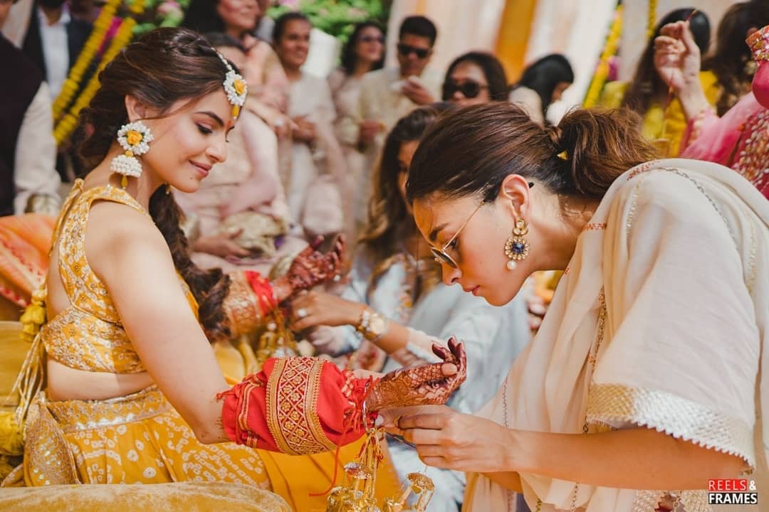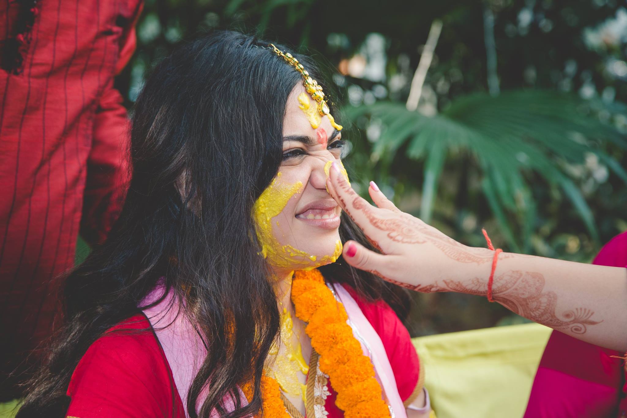 Both the bride and the groom sit for this ceremony at their respective homes. A paste of haldi is applied on their faces and body to get that natural glow on their wedding. All the family members and relatives also apply oil on the bride and the groom’s forehead and give their blessings. This ceremony is also known as vatna.