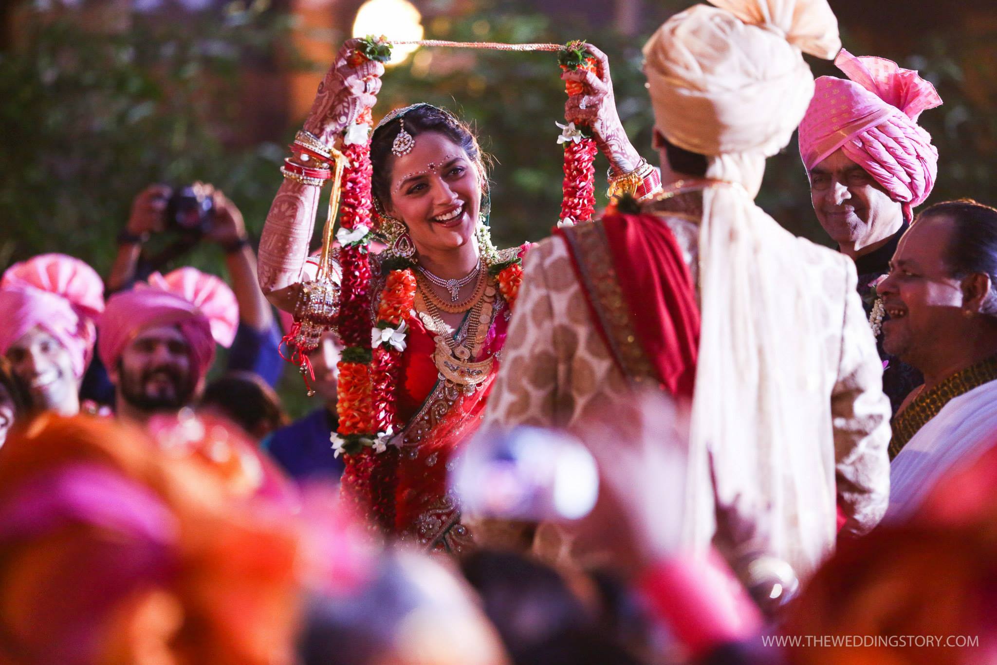 The bride and the groom exchange flower garlands before they head for the pheras (vows).