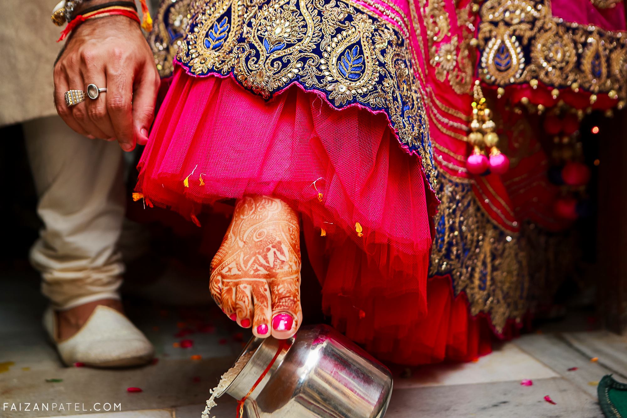 The father of the bride gives his daughter’s hand to the groom. The couple then takes seven mangal pheras around the sacred fire.