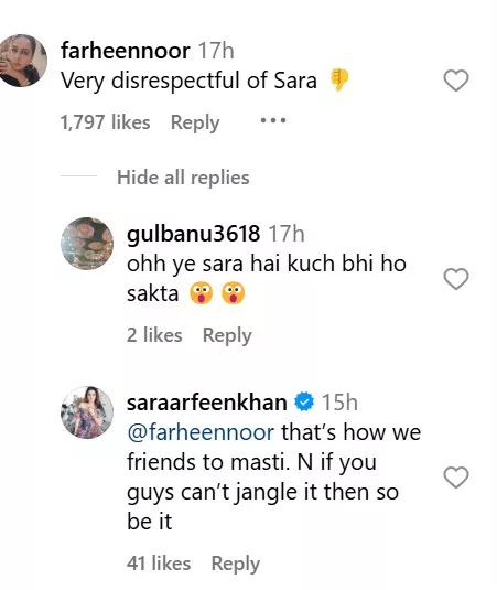 One user looking at the video commented, "Very disrespectful of Sara." Another one wrote, "Reaction was cute but the kick is not at all appropriate. Sara ko tameez nhi hai very bad Sara." A third user also shared, "That was quite disrespectful and am sure @nyra_banerjee was unaware about that." A user also said, "Learn some manners and basic etiquette. What if someone does this to you? Would you like it. Dosti and all sab thik hai but publicly iss tarah behave karna is not done behaviour."