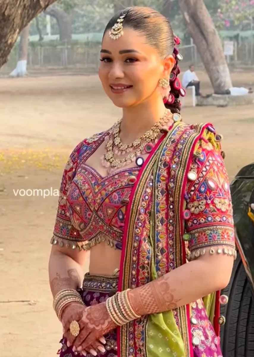 On March 3, 2026, Arjun's sister, Sara, looked beautiful in a Gujarati lehenga. Her maroon-hued dress with multicoloured thread and mirror-work lehenga was the perfect choice for the mehendi function. Sara styled her look with a contrasting green-hued dupatta, and it was also hemmed with colourful mirror-work detailing.