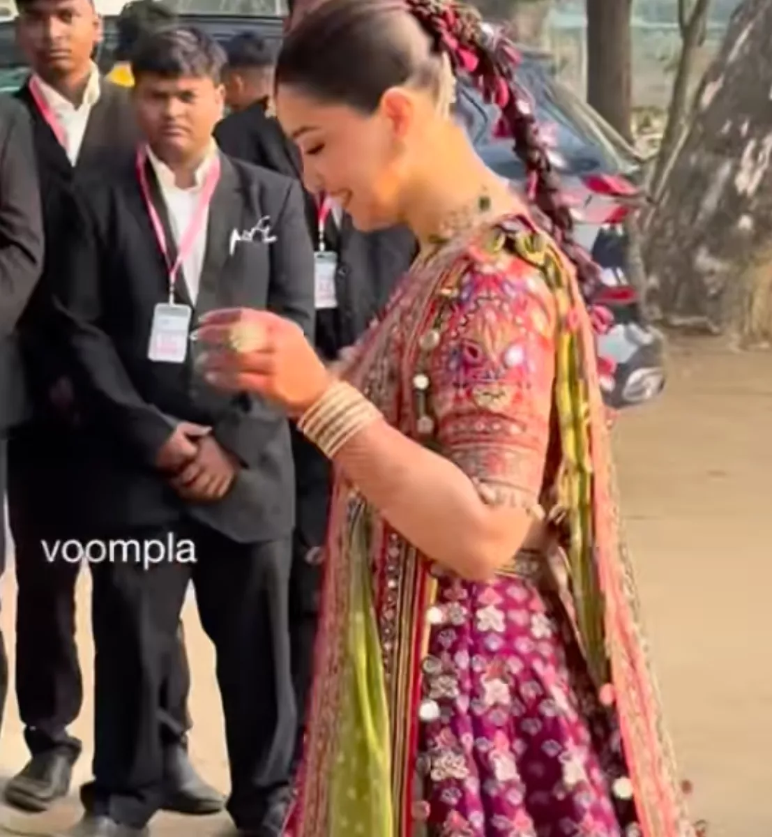 The bride-to-be, Saaniya, was dressed up in a gorgeous silver mirror-work lehenga with a pink-hued net dupatta. However, the highlight of her look was her heavy kaleeras which made her stand out from the crowd. It is worth mentioning that kaleeras are the ornaments that are worn by a Punjabi bride on the day of the wedding. On the other hand, her groom looked handsome in a contrasting beige-hued sherwani. Anjali wore a purple-hued sharara while Sachin Tendulkar donned a green-hued kurta-pyjama with a floral jacket.