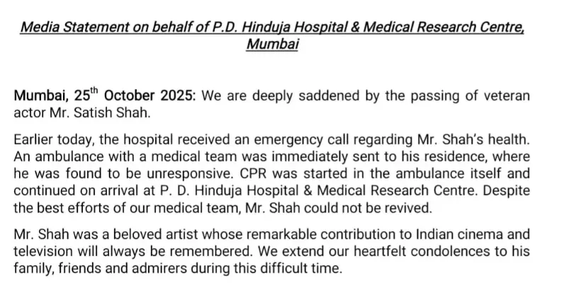 "We are deeply saddened by the passing of veteran actor Mr Satish Shah. Earlier today, the hospital received an emergency call regarding Mr Shah's health. An ambulance with a medical team was immediately sent to his residence, where he was found to be unresponsive. CPR was started in the ambulance and continued on arrival at P.D. Hinduja Hospital and Medical Research Centre. Despite the best efforts of our medical team, Mr Shah could not be revived."