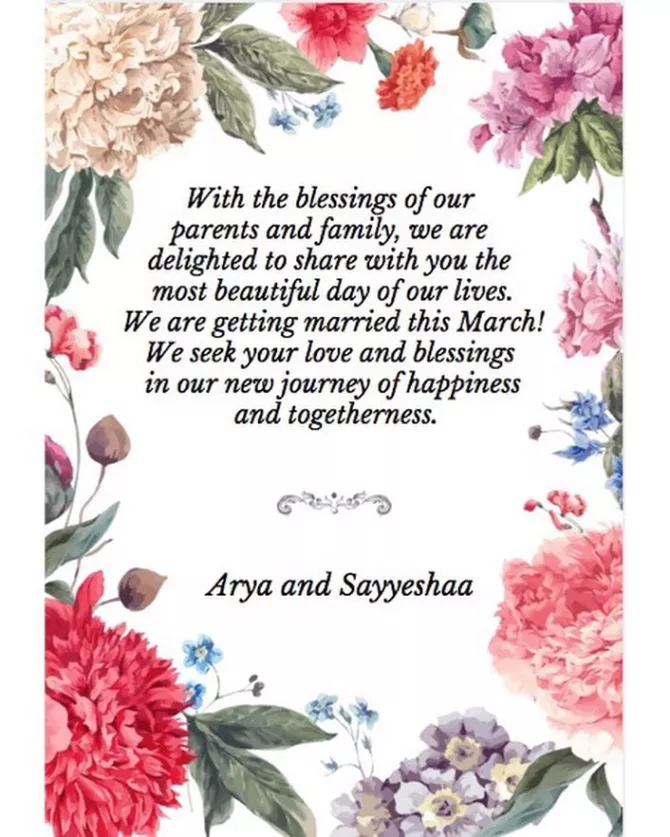 “With the blessings of our parents and family, we are delighted to share with you the most beautiful day of our lives. We are getting married this March! We seek your love and blessings in our new journey of happiness and togetherness.”