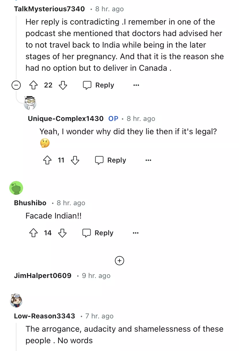 As soon as a Redditor shared Shanice reply on the discussion platform, netizens flooded the comments section and expressed how Shanice and Nikhil's viewership has gone down. Some even called them arrogant for choosing Canadian citizenship for their babies. One user wrote, "I feel like influencers should not vlog or document their questionable choices. Birth Tourism is kinda frowned upon and that’s why they call their children, “anchor babies” which is cruel to the child."