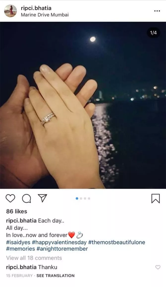 It was on March 2019, that amidst wedding rumours, we had shared a beautiful picture of Sharad Malhotra’s fianceé, Ripci Bhatia’s ringed-hand, which suggested that they are now an engaged couple. Amidst the backdrop of the beautiful Marine Drive in Mumbai, Ripci had uploaded the beautiful picture and had captioned it as, “Each day.. All day.. In love.. now and forever” followed by ring and heart emojis. She also ended her caption with the hashtags, #isaidyes, #happyvalentinesday, #themostbeautifulone, #memories, #anighttoremember. Checkout a snapshot of her post:
