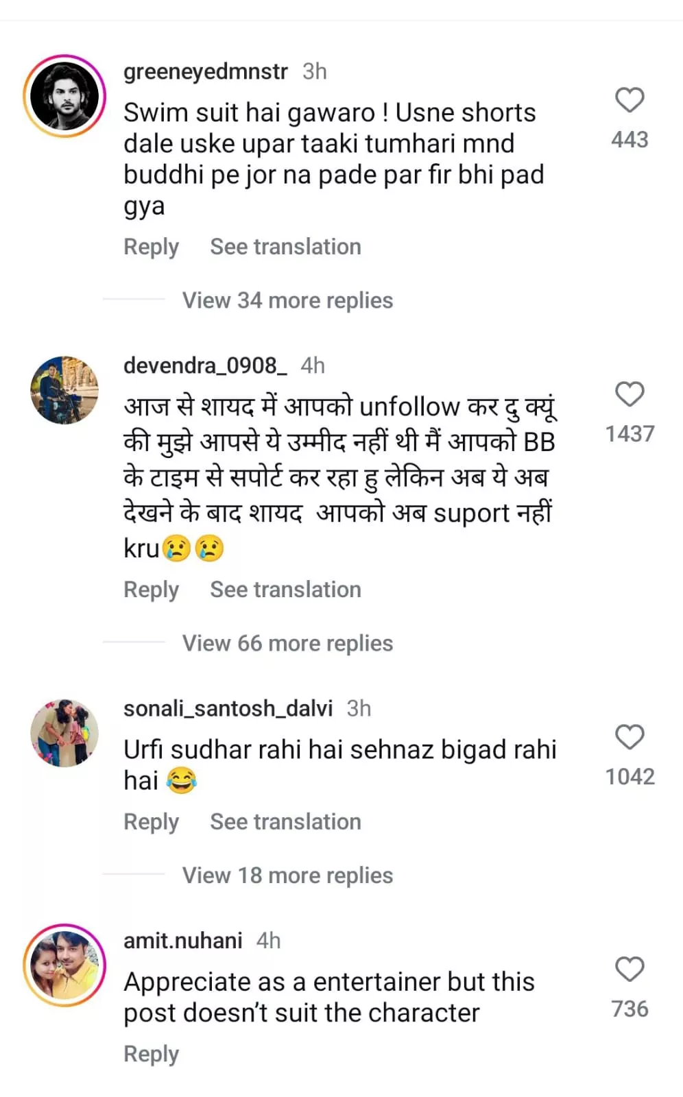 A user on Instagram shared that all like her pictures but this swimwear picture dump is not good. The beachwear does not suit her. Another one shared that Shehnaaz is appreciated as an entertainer but this post doesn’t suit the character. A third one said, "Uorfi sudhar rahi hai sehnaz bigad rahi hai." Another one even wrote, "Aap cute hi acchi lagti thi, pls app phirse dressed up thik karliye we miss old you the cute one not this vulgar."