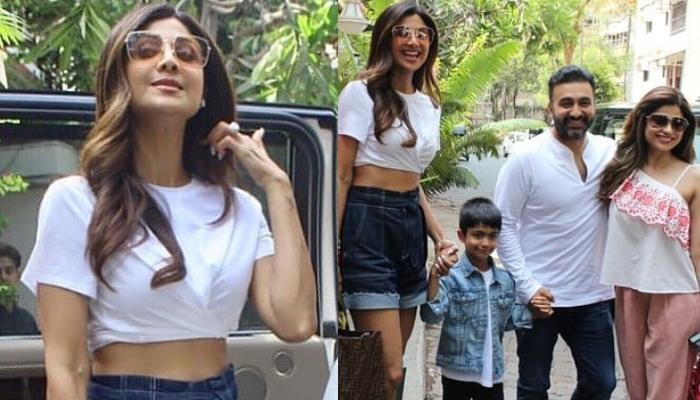On June 8, 2019, Shilpa turned 44, and she celebrated her day with husband, Raj Kundra, son, Viaan and sister Shamita Shetty. In the pictures, we can see the family posing for the lens after a lunch date. The actress looked in her twenties as she donned a pair of high-waisted denim shorts with a white crop tee. Take a look at the pictures below: