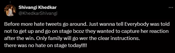 "Before more hate tweets go around. Just wanna tell Everybody was told not to get up and go on stage bcoz they wanted to capture her reaction after the win. Only family will go wer the clear instructions. there was no hate on stage today!!!!"