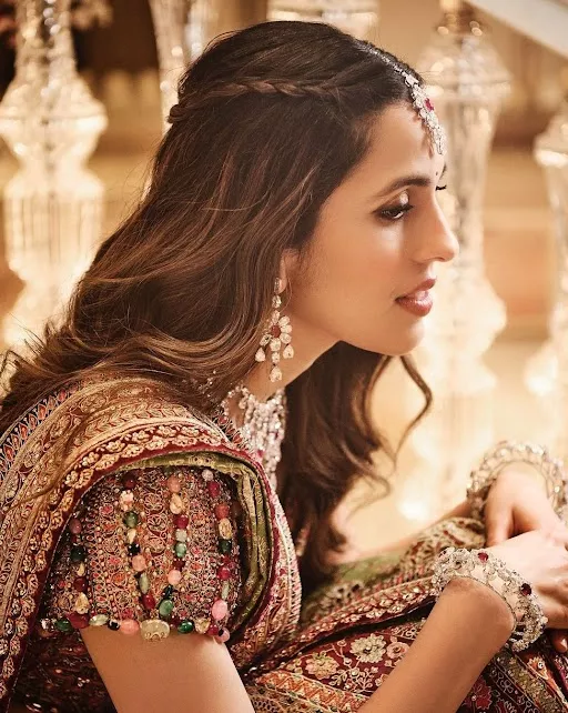 The choli had gems embellished on the puffy sleeves, and zari designs all over. Shloka completed her matte makeup with shimmery pink shadowed and kohl-rimmed eyes and glossy pink lips. Shloka slipped into diamond and ruby bangles for accessories with a matching necklace and mang teeka.
