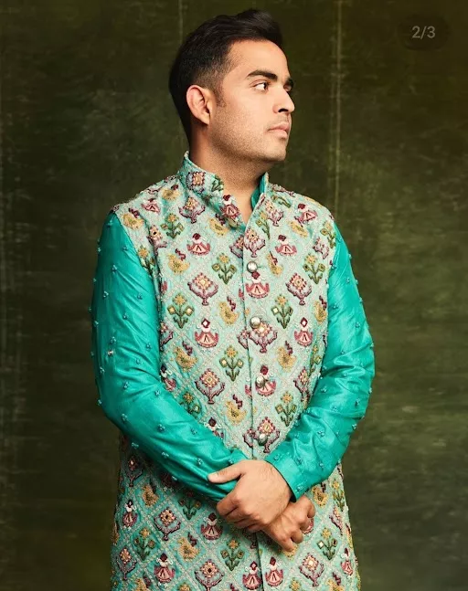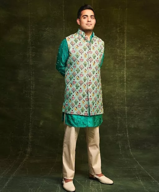 The set features a green-hued kurta with French knots embroidered with resham. It even had zardozi threadwork with mirror detailing, turq braille knots, and ivory slim breech pants. He completed his look with a printed Nehru coat with a short collar. Ekalakhini styled Akash's look for the night.