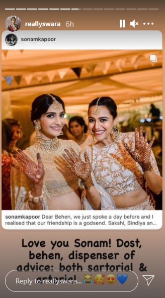 On April 9, 2021, Sonam Kapoor Ahuja took to her Instagram handle and wished her one of the favourite co-stars, Swara Bhaskar, with whom she had starred in multiple films like Raanjhanaa, Prem Ratan Dhan Payo, and Veere Di Wedding. The actress shared a heart-melting birthday wish for her sister-alike-friend with some unseen pictures from her wedding ceremonies. While the first picture was from Sonam's sangeet ceremony in which, the two looked gorgeous in their respective outfits, the second one was from Sonam's D-day, where she could be seen posing for the camera with her sister, Rhea Kapoor and Swara. Along with these stunning pictures, Sonam penned a beautiful note, and it can be read as "Dear Behen, we just spoke a day before, and I realised that our friendship is a godsend. Sakshi, Bindiya and Chandrika... of every person you've essayed, my favourite remains the one you are off-screen. May your voice only amplify with time, love you lots. Happy happy birthday, Swaru. @reallyswara."