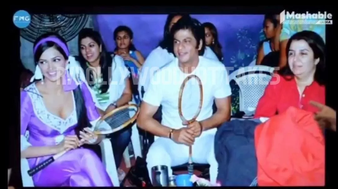 "Pooja Dadlani ko dekh rahe ho piche. She was Deepika's manager at that time. Aur I think ye dekh rahe hai, mere assistant Shah Rukh ko dikha rahe hai the Jeetu ji ka racket paer ke niche se kaise marna hai. And I think this was the day when Deepika's parents came on shoot."