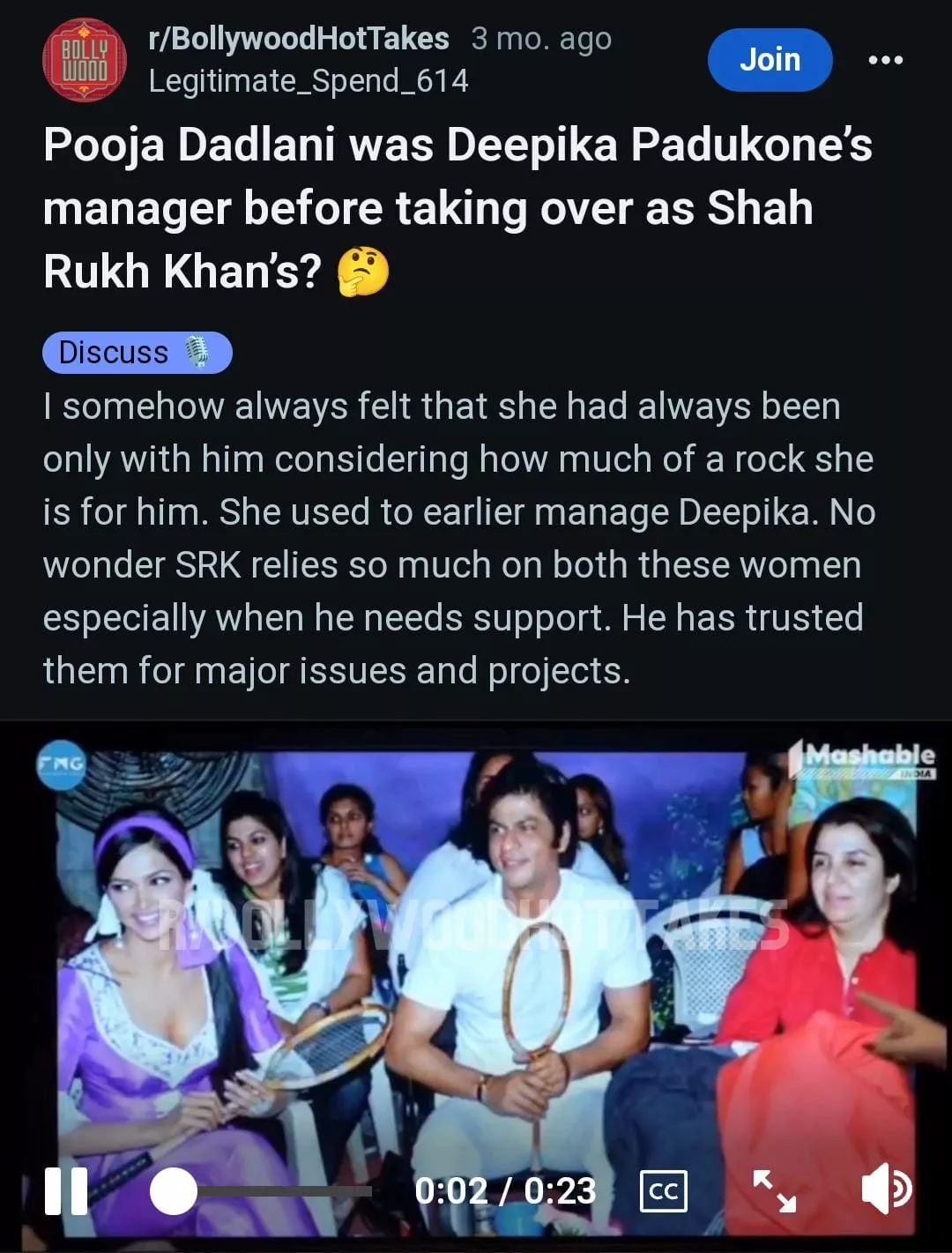 A few months ago, a Redditor posted an old photo from Deepika Padukone and Shah Rukh Khan starrer Om Shanti Om's shoots. In the photo, we can spot the two stars sitting in the front line along with the director of the film, Farah Khan. Both Deepika and SRK were reportedly gearing up for their song shoot, which was a remake of Dhal Gaya Din Ho Gayi Sham from Humjoli, sung by Asha Bhosle and Mohd. Rafi. But what caught our attention was that behind Deepika, SRK's current manager, Pooja Dadlani was seated.
