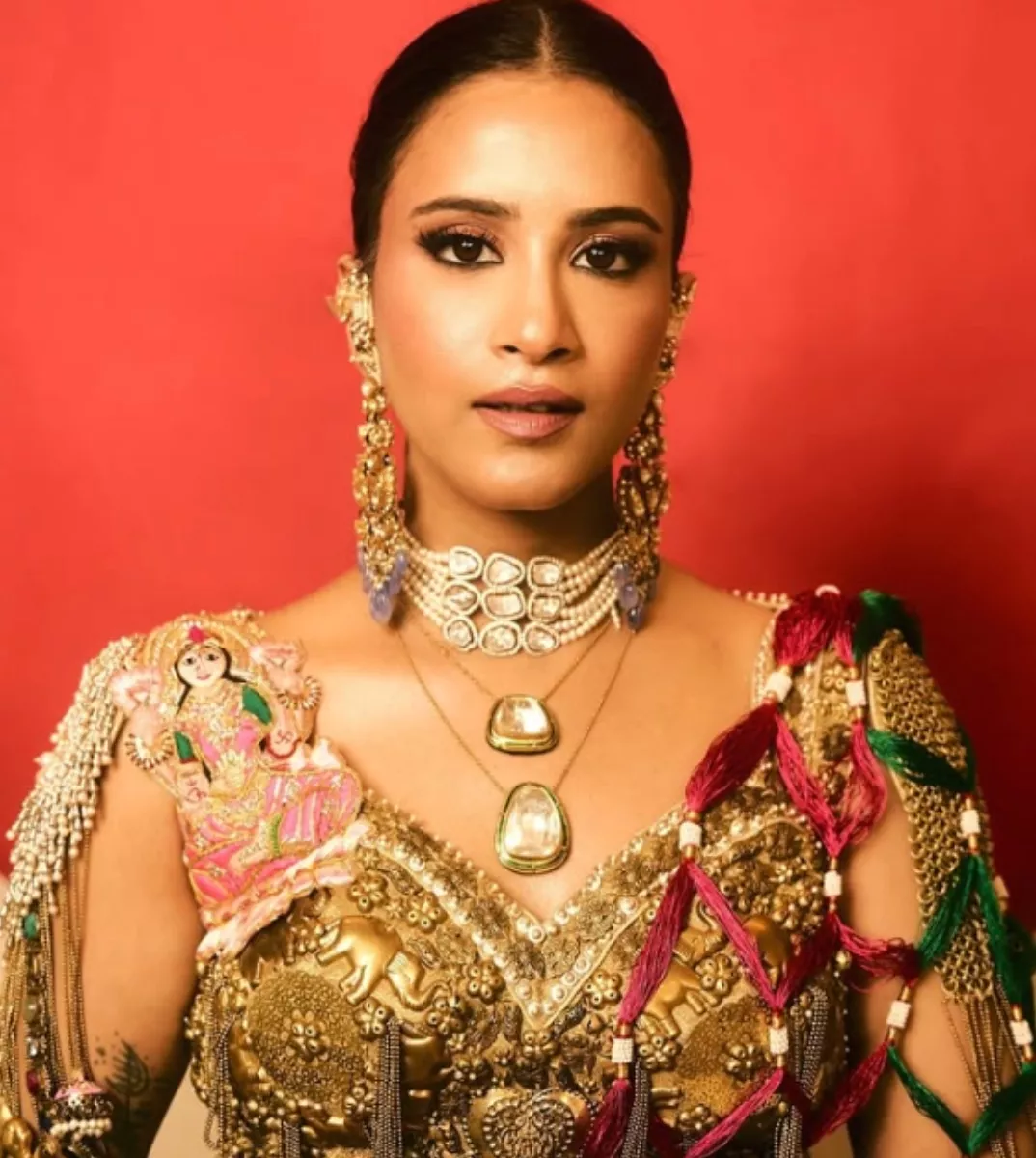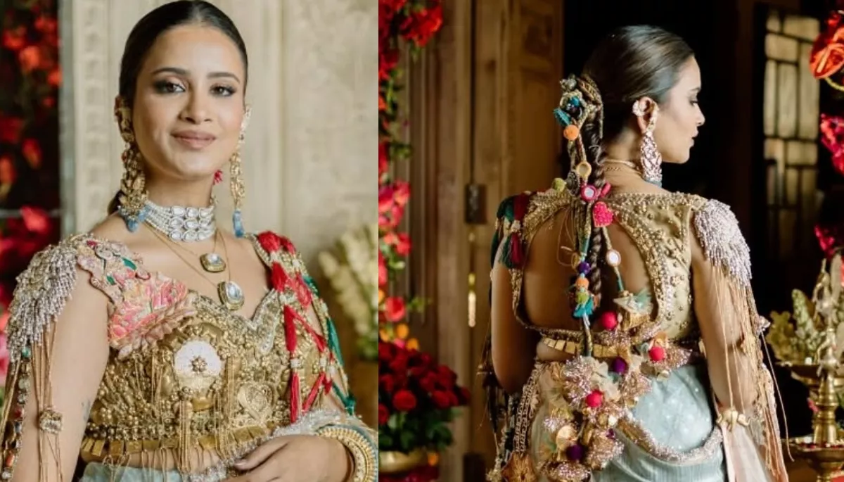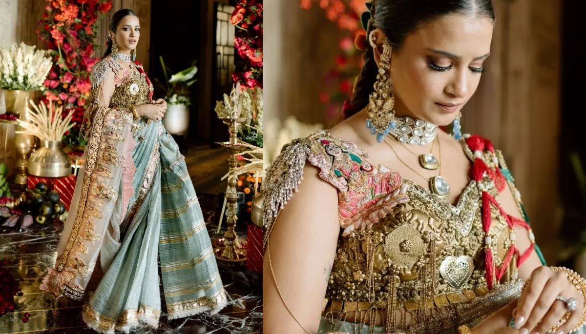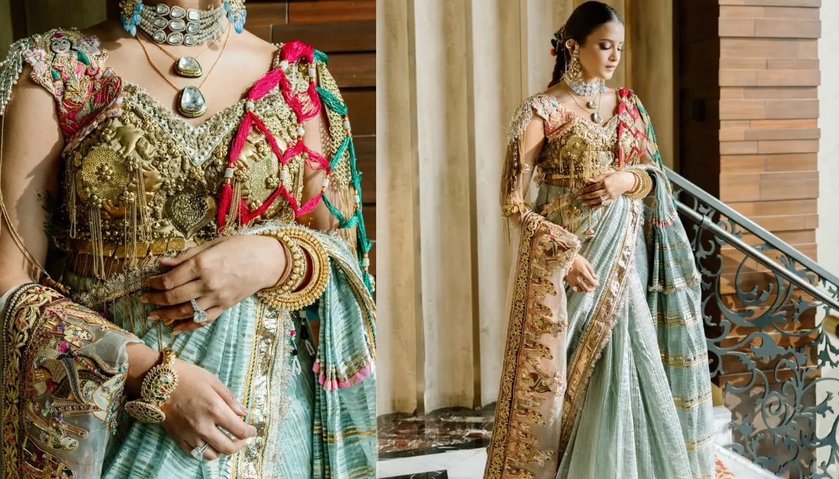 "As I step into this new chapter, every part of this look feels like a reflection of my journey. The mint blue saree, with delicate gold gota work, mirrors the calm and joy in my heart, while the dupatta, adorned with intricate depictions of Radha Krishna’s Raasleela & sacred shlokas, celebrates the beauty of divine love. The metal jeweled blouse, featuring the grace of Laxmi Ji, is paired with metallic motifs and tassel details, adding an elegant touch. My braid, embellished with vibrant tassels, carries the essence of playful tradition, while the red dot behind me, inspired by the ‘lal bindi, stands as a symbol of strength, love and auspicious beginnings."