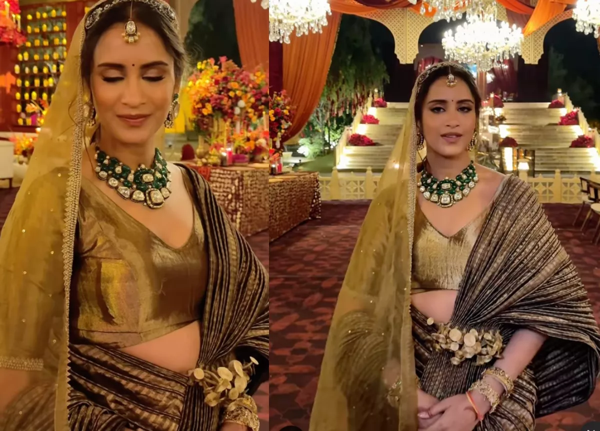 Talking about her wedding look, Garima yet again left us bowled with her choice of outfit. Instead of picking a usual lehenga, she went all fashionista by picking a saree lehenga in gold. The bride chose a crinkled saree lehenga, which had 3D detailing on the waist. Her pallu was pinned over her other hand. She styled it with a v-neck blouse. A sheer golden dupatta completed her look.