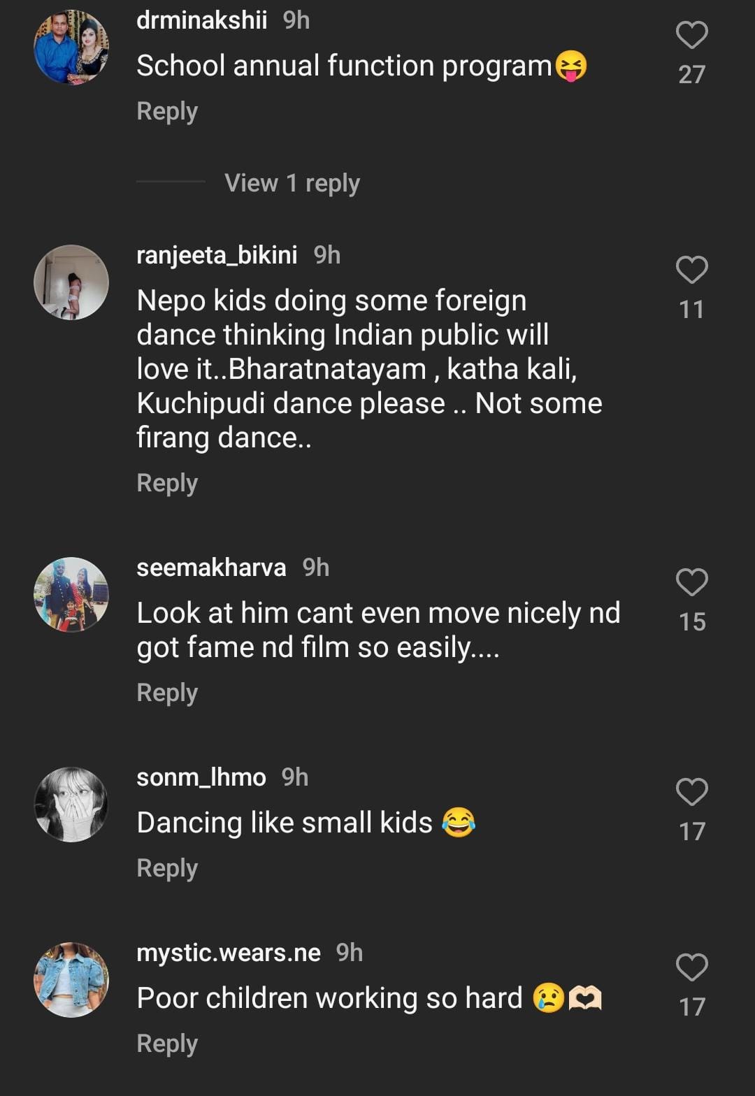 As soon as the videos from the event, surfaced on the internet, netizens started bashing the celebrity kids for their performance. One user commented, "Nursery school dance..." Another user mentioned, "Nepo kids doing some foreign dance thinking Indian public will love it..Bharatnatayam , katha kali, Kuchipudi dance please .. Not some firang dance.." One more user wrote, "When you badly copy the west instead of promoting your own culture and end up doing buffoonery." Check out the comments: