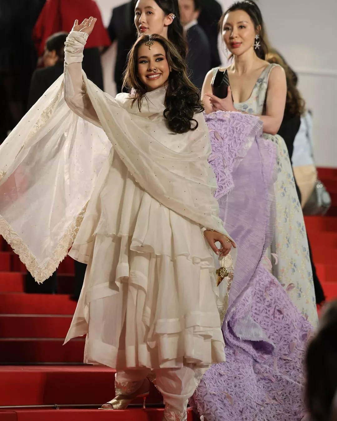 The moment fans witnessed Sunanda walking the red carpet at Cannes 2024, it felt like a personal achievement. For her first appearance, Sunanda donned a pretty white-hued patiala suit, featuring an anarkali-styled kurta with sheer sleeves and dupatta. The singer looked pretty by donning a maang teeka and a nath. Soft-toned makeup with mascara-laden eyes, eyeliner and glossy lips completed her look. Sunanda's look was completed with soft curls.
