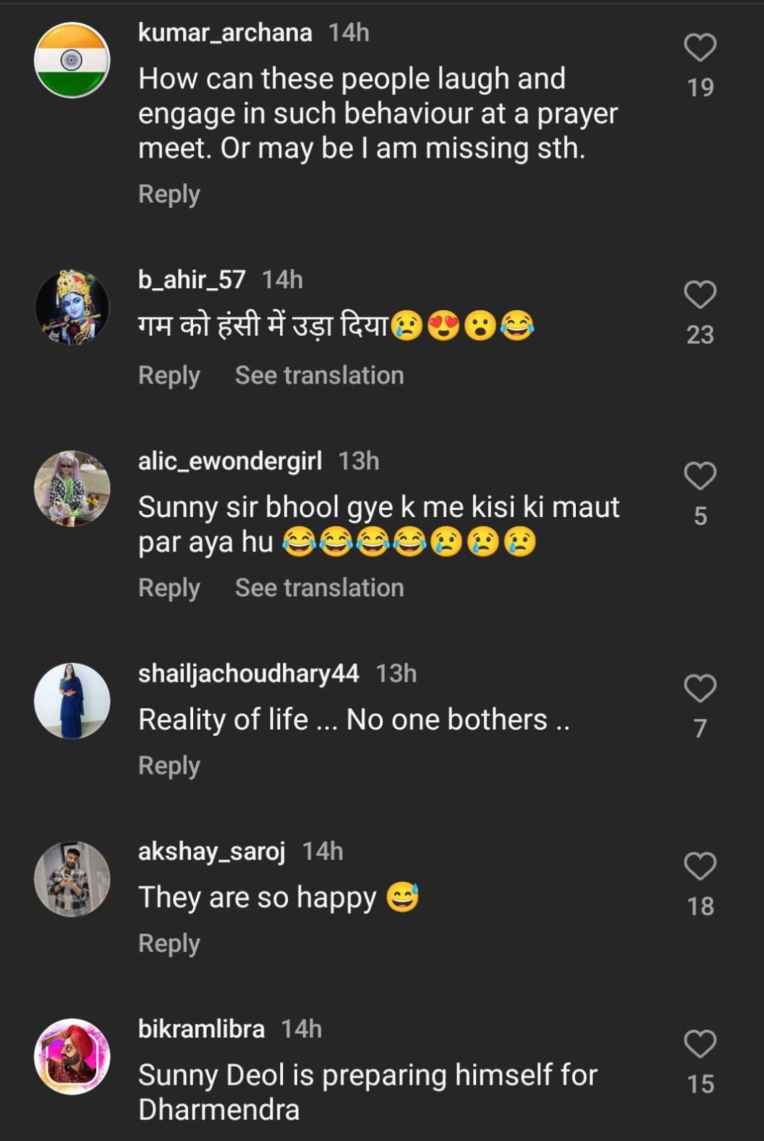 As soon as the video from Rajkumar Kohli's prayer meet surfaced on the internet, netizens started slamming Sunny Deol for laughing over there. One netizen wrote, “Shamelessness, laughing like this in front of deceased person’s son.” While one more user asked, “Who laughs so much at a prayer meet? Shameless.” Check out the comments: