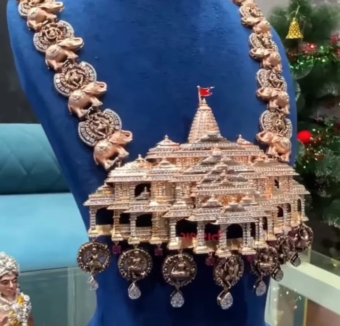 Recently, a diamond merchant, Kaushik Kakadiya, the director of Rasesh Jewel, from Surat, gave an ode to Ram Temple by designing a diamond necklace with 5,000 American diamonds. It is a masterpiece as it is made on the theme of Ram Temple, and every detail of it is carefully made. The artist has decided to gift the necklace to Ram Temple in Ayodhya.