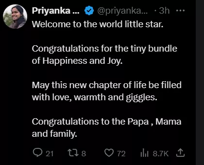 After Tejashwi announced the arrival of his second baby, the comment section was filled with congratulatory messages. Priyanka Bharti, the National spokesperson of RJD, was one of the commentators. She penned down a beautiful note, congratulating Tejashwi and his family. In her words: