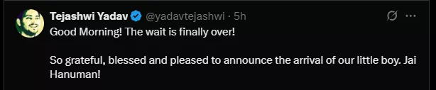 Tejashwi Yadav and his wife, Rajshri, embraced parenthood for the second time. Tejashwi tweeted the joyous news and penned down a short, heartfelt note. Read on to know more.