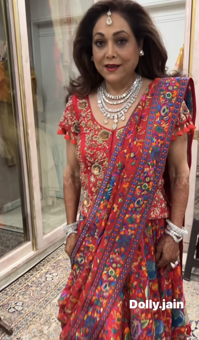Now, the drape queen, Dolly Jain shared a video of Tina Ambani’s gorgeous look for her son, Anmol Ambani’s reception party. For the party, Tina Ambani wore a red lehenga with a long choli. While her blouse was heavily embroidered with golden thread in a floral pattern, her skirt and dupatta looked hand-painted with multi-coloured floral designs. She completed her look with a four-layered diamond set, stud earrings, a matching mang teeka and three broad diamond kadhas. In the video, Dolly Jain can be seen pinning her dupatta with smaller pleats on her shoulder taking it across her body from the front and tucking it at the back. While Tina looked glamorous in a red lehenga, her bahu, Khrisha Shah had worn a lavender coloured saree gown, and we must say that the saasu maa indeed gave a tough competition to her daughter-in-law.