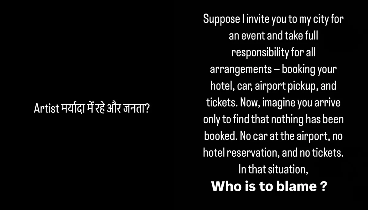 He further stated that if that artist even reaches that place believing that person who promised to arrange everything, and finds out that nothing promised has been done, then who should be blamed? He also captioned the post by saying that it's a hypothetical situation and a question, not for any particular one, which means he wants to gather actual responses from the public who, without knowing the full story, criticised his sister, Neha. In a follow-up post, Tony again asked a question if an artist should be in dignity, then what should the audience do?