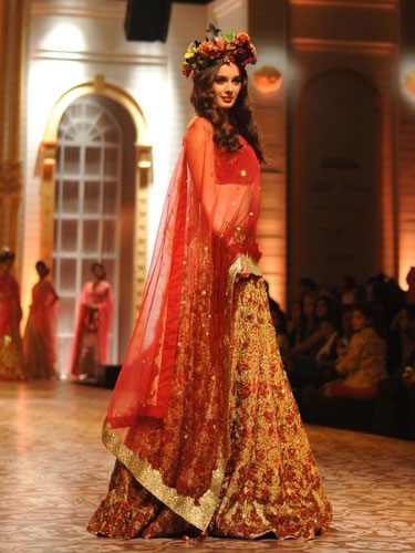 Falguni & Shane Peacock have beautifully teamed the plain flower girl with a traditional Indian bride. And Evelyn Sharma looks the perfect coy bride here. A headgear would totally spruce-up a typical wedding lehenga, wouldn't it?