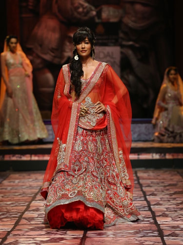 If you are one of those who love all things big and beautiful, you will sure love Chitraganda in Suneet Varma. Going beyond the simple red lehenga, Suneet has added layers and intricate, heavy embellishments. Is this your favourite?
