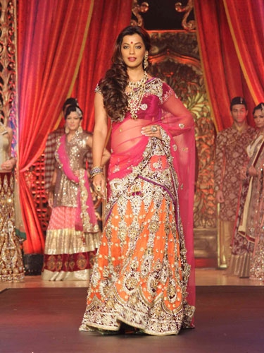 Vikram Phadnis' all in all traditional look, carried perfect by the rather demure-looking Mugdha Godse, defines the colourful Indian wedding. The blend of orange, mauve and pink completes the look, and the rich silver work just cannot be ignored.
