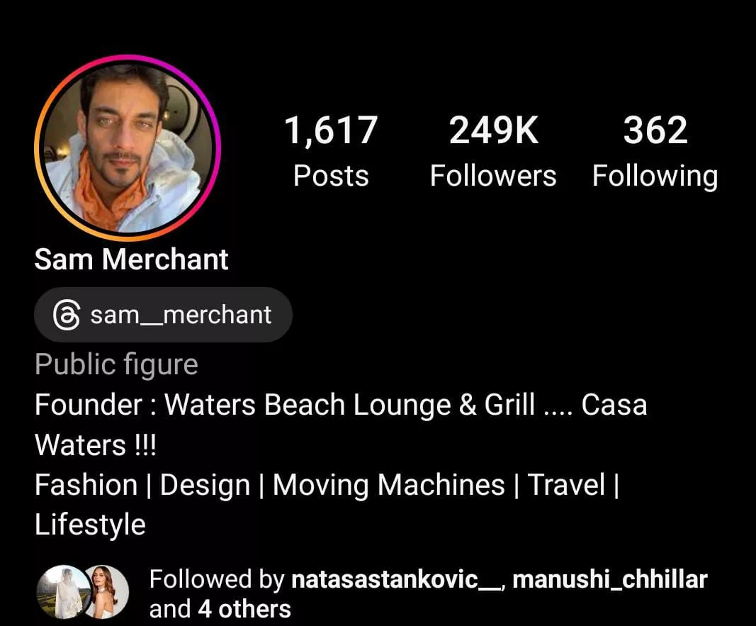 As per his bio on IG, Sam Merchant is the owner of Waters Beach Lounge & Grill in Goa. He has a fan following of a total of 249K on his IG handle, which includes several actors and actresses from B-Town, like Manushi Chhillar, Tiger Shroff, and Disha Patani, among others. As per another report by Deccan Chronicle, the handsome hunk used to work as a model, and back in 2002, he won the Gladrags Manhunt Contest, a unisex pageant.