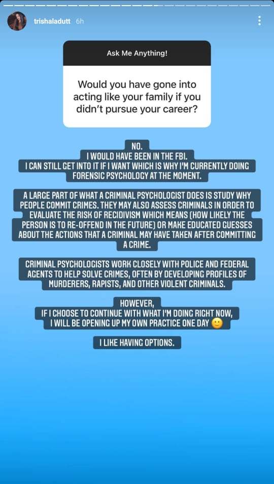 In the same ‘Ask Me Anything’ session, Trishala Dutt was asked if she is single. To which, she replied, “Yes”. Another follower asked her if she would have pursued acting like her star family. To which, Trishala retorted, “No. I would have been in the FBI. I can still get into it if I want which is why I’m currently doing forensic psychology at the moment. A large part of what a criminal psychologist does is study why people commit crimes. They may also assess criminals in order to evaluate the risk of recidivism which means (how likely the person is to re-offend in the future) or make educated guesses about the actions that a criminal may have taken after committing a crime. Criminal psychologists work closely with police and federal agents to help solve crimes, often by developing profiles of murderers, rapists, and other violent criminals. However, if I choose to continue with what I’m doing right now, I will be opening up my own practice one day. I like having options.”