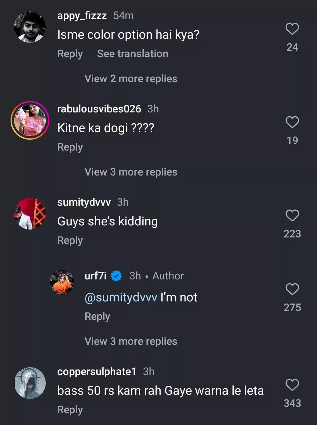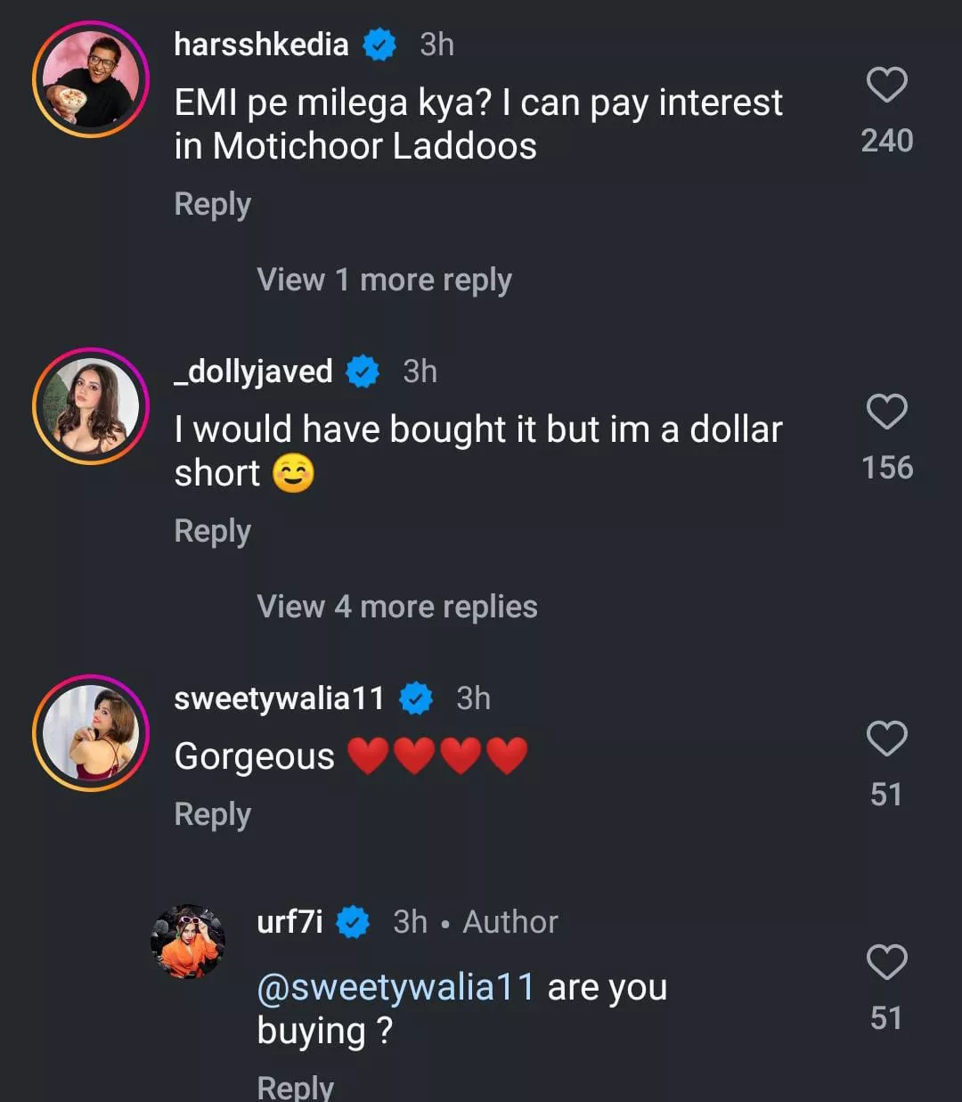One user commented, "EMI pe milega kya? I can pay interest in Motichoor Laddoos." Another user joked, "Bass 50 rs kam rah Gaye warna le leta." A third user wrote, "That’s sasta….you should double the price love." Another comment can be read as, "price thoda kam hain nahi toh zaroor kharid leta kisi na kisi k liye."